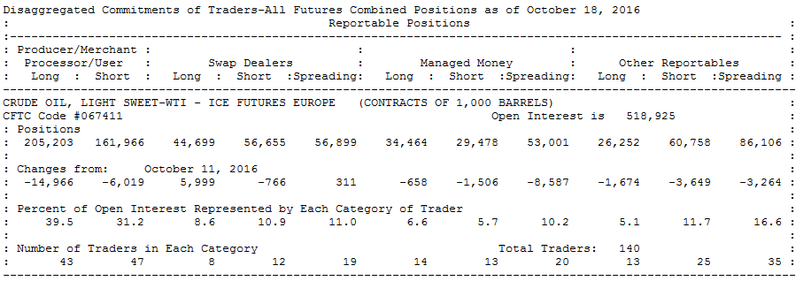 The Commitments of Traders (COT) reports provide a breakdown of each Tuesday’s open interest for markets in which 20 or more traders hold positions equal to or above the reporting levels established by the CFTC. Within the COT report traders are split into reporting and not reporting entities. The CFTC adjusts the minimum reporting threshold on a inconsistent basis . The aggregate of all traders’ positions reported to the Commission usually represents 70 to 90 percent of the total open interest in any given market. For the COT Futures-and-Options-Combined report, option open interest and traders’ option positions are computed on a futures-equivalent basis using delta factors supplied by the exchanges. Long-call and short-put open interest are converted to long futures-equivalent open interest. Likewise, short-call and long-put open interest are converted to short futures-equivalent open interest. For example, a trader holding a long put position of 500 contracts with a delta factor of 0.50 is considered to be holding a short futures-equivalent position of 250 contracts. A trader’s long and short futures-equivalent positions are added to the trader’s long and short futures positions to give “combined-long” and “combined-short” positions.